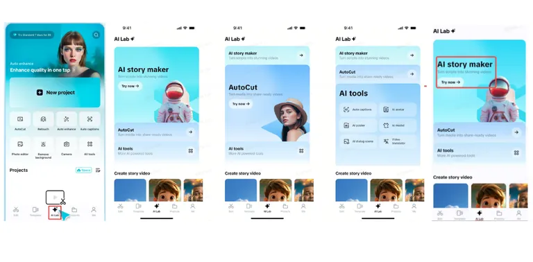 Step 1: Open the AI Lab and Choose AI story maker Start by launching CapCut and tapping "AI Lab" at the bottom. You’ll see options like "AI story maker", "AutoCut", and various "AI tools". Select "AI story maker" and then click "Try now" to start customizing.