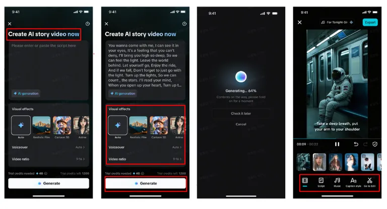 Step 2: Create and edit your story Type or paste your script into the "Create AI story video now" input box. Pick a style—Realistic Film, Cartoon 3D, or Anime—that fits the audience or platform. Add a "Voiceover" if needed and modify the "Video ratio" depending on where you plan to post. Then tap "Generate".